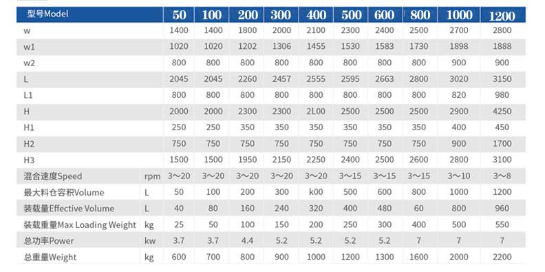 該機(jī)回轉(zhuǎn)體(混合料斗)與旋轉(zhuǎn)軸線成30°夾角,物料在隨著回轉(zhuǎn)體翻動(dòng)的過程中,同時(shí)沿著四壁做切向運(yùn)動(dòng),從而達(dá)到最佳的混合效果。